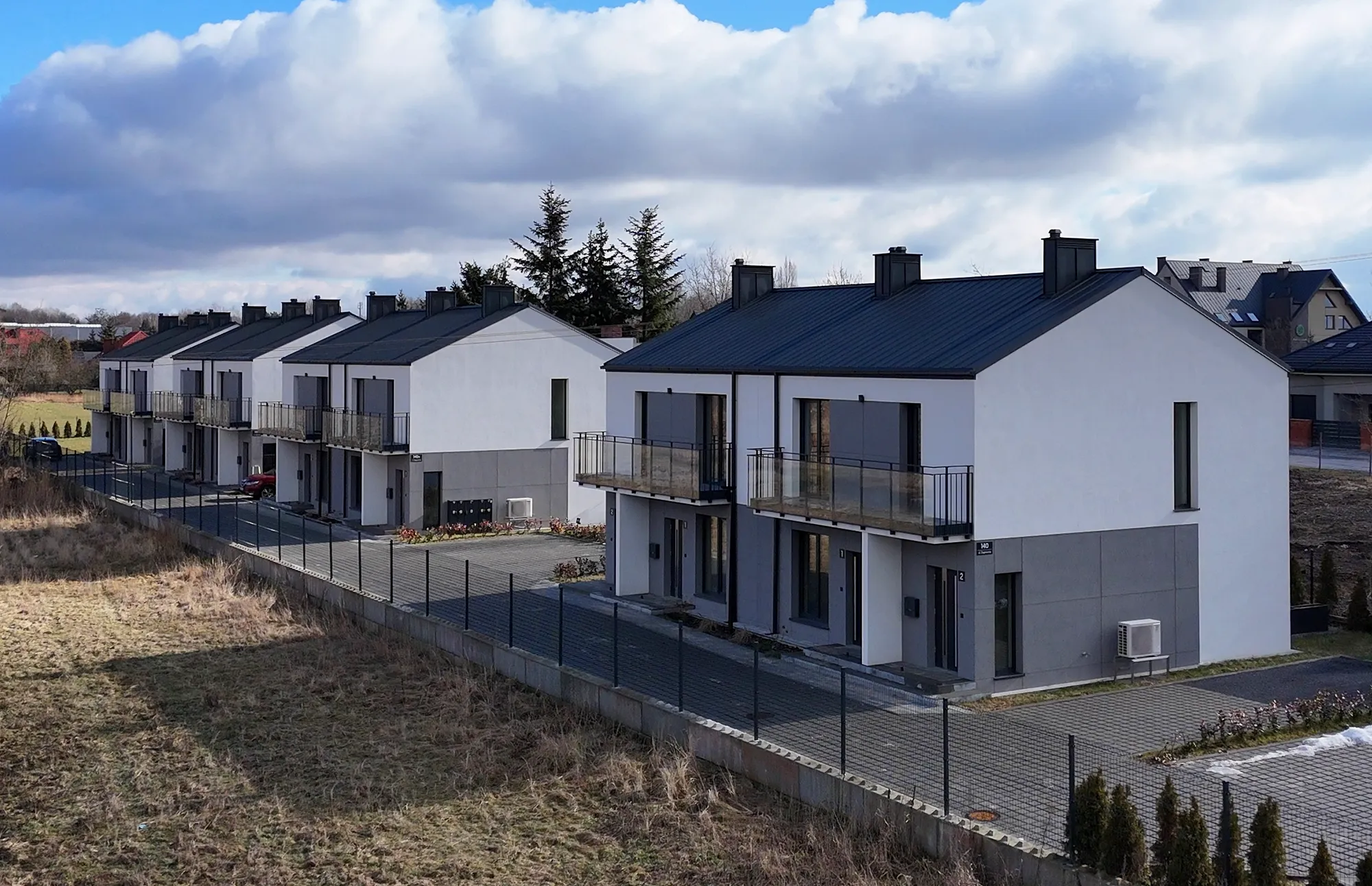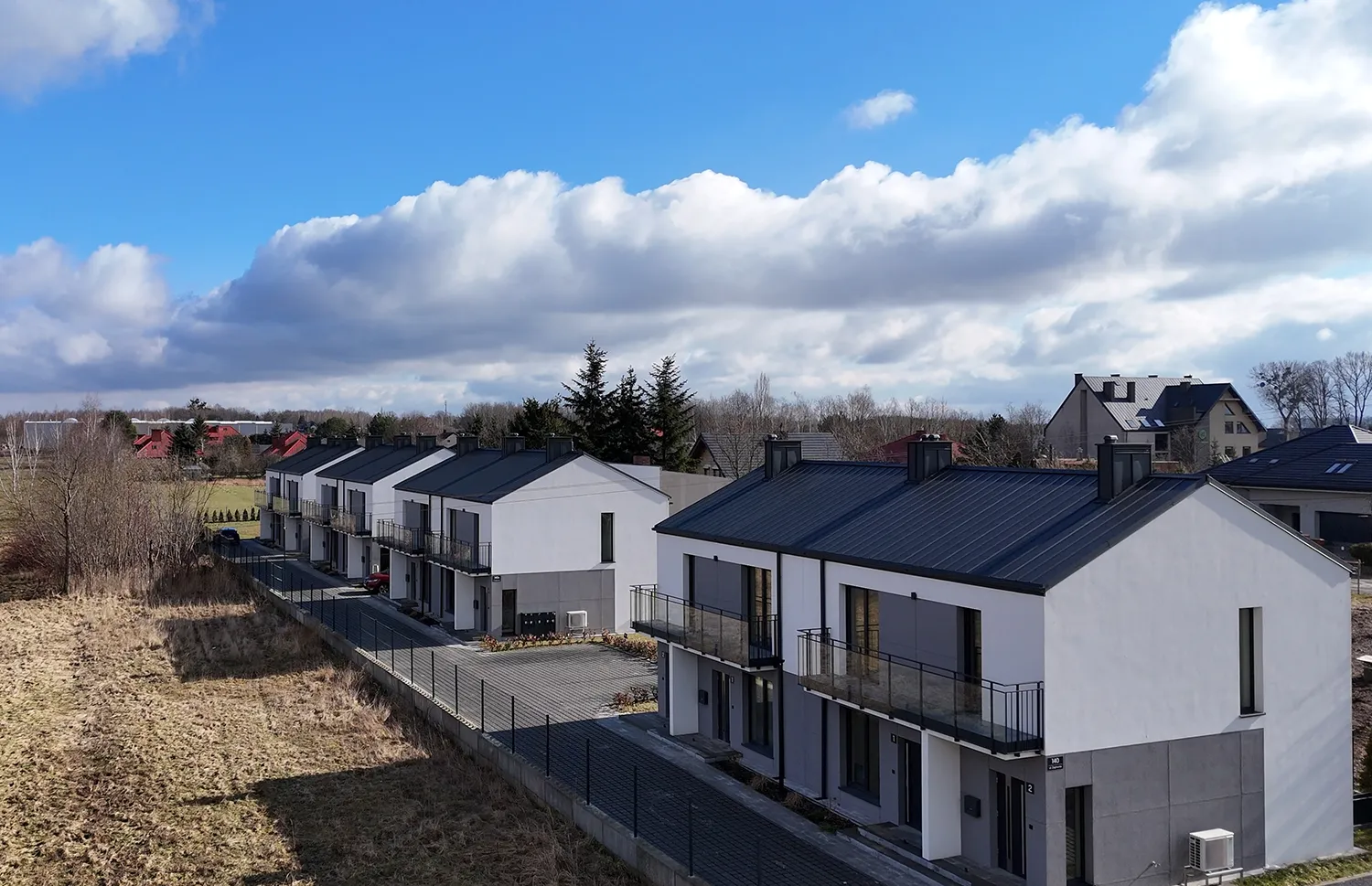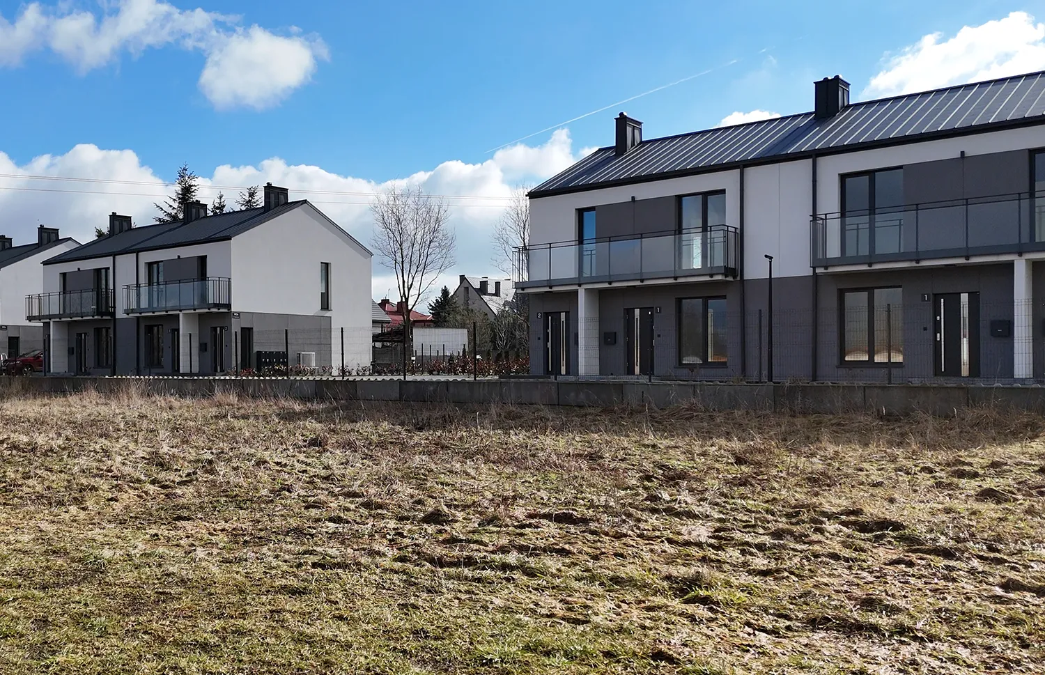 Każdy budynek posiada 2 kondygnacje nadziemne, a mieszkania wyposażone są w przestronne balkony, tarasy lub własne ogródki, co sprzyja kontaktowi z zielenią i ułatwia codzienny odpoczynek. Duże przeszklenia zapewniają doskonałe doświetlenie pomieszczeń oraz poczucie przestrzeni.